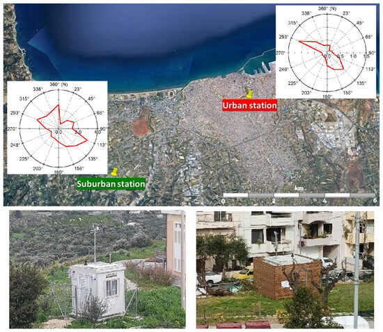 Aerosol samples were collected at an urban and a suburban site of Heraklion, Crete, Greece. The urban station is located in a very small park in the city center, while the suburban station is located at 5.9 km southwest (SW) of the urban station on the campus of the University of Crete, next to the Department of Chemistry (Figure 1). The urban station is a traffic station located close to one of the city’s main avenues leading to the city center and the port of Heraklion. The suburban site is a sparsely populated area with agricultural activity, mainly olive trees, where the influence of direct local anthropogenic emissions is limited. During the study period, the average temperature recorded at the urban station was 12.7 °C ± 1.6 °C, compared to 11.7 °C ± 1.5 °C at the suburban station. The relative humidity was 61.7% ± 6.5% at the urban station and 67.8% ± 5.8% at the suburban station. The wind directions for both stations are classified as predominantly northwest (NW) and southeast (SE), indicating similar influences from long-range transport pollutants. The urban station shows a clearer wind direction dominance and stronger prevailing winds coming from the NW than the suburban station, which experiences stronger winds from the SW and shows a more dispersed in the wind direction pattern. Overall, the suburban station is susceptible to higher wind speeds than the urban station, with average wind speeds 2.3 m/s and 0.9 m/s, respectively. It should be noted that the wind speed at the urban station is influenced and obstructed by the taller buildings in the area, whereas the suburban station is free from direct obstruction due to its elevated location. Based on the relative locations of the stations and the prevailing winds, it is expected that there was little transport of urban emissions to the suburban station during the period studied. An analysis of the 5-day back trajectories reaching Heraklion that was carried out with the HYSPLIT model [35] showed that the extended Heraklion area was affected by transported air masses from W-SW from 7 to 13 February, then from the N-NE sector from 14 to 21 February, before becoming well mixed, regionally influenced air masses from the SW, S, and E. Overall, from 14 February to 2 March, the air masses reaching Heraklion were largely influenced by the regional sources in the eastern Mediterranean, resulting in an aged background atmospheric composition over the area studied.