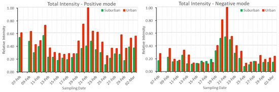The Mzmine analysis process resulted in the detection of 2809 and 3823 features for positive and negative modes, respectively. As a first step, the total intensity of every feature for all samples was summed for both modes. Samples from the urban station showed a higher total intensity compared to those from the suburban station. Specifically, compared to the suburban samples, the urban samples had on average a 55% higher total intensity in positive mode, and a 39% higher total intensity in negative mode (Figure 2). This is expected due to the intense anthropogenic activity in the urban environment, which leads to more particulate organic emissions. The higher percentage increase for the positive ion mode, compared to the negative ion mode, in the urban samples than in the suburban samples indicates that these wintertime anthropogenic emissions are richer in compounds that ionize better in positive mode rather than in negative mode.