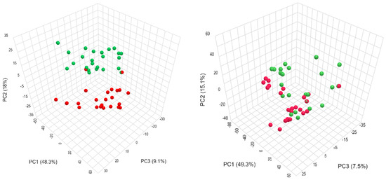 Results of 3d PCA for urban (red) and suburban samples (green) using positive ion mode features (left) and negative ion mode features (right). Log10 data transformation was applied.