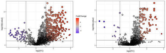 To further investigate the features responsible for this clustering, volcano plots were created for both ionization modes. Significant features for each station (Figure 4), in addition to the unique features, had at least a five times higher average concentration (fold change FC > 5) at that station than at the other station, and this difference is statistically significant by t-test with FDR (False Discovery Rate) corrected p < 0.05.