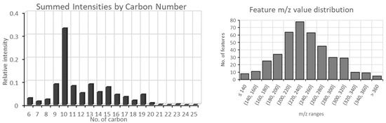 The majority of these significant urban features have a measured m/z in the range of 200–260 m/z (Figure 5). Regarding the intensity-weighted number of C, C10 clearly dominates the distribution. Molecules with a carbon number 20 or more have insignificant levels relative to the overall intensity.