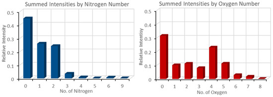 Combined abundance of the positive mode urban significant features related to combustion as a function of the number of nitrogen atoms (left) and oxygen atoms (right) in the calculated elemental composition of the respective feature.