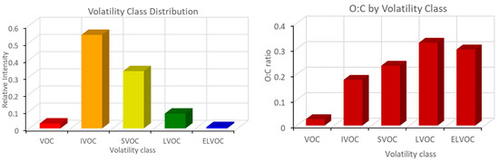(left) Relative intensity of each volatility class, for the positive mode urban significant features related to combustion. (right) The estimated O:C ratio per volatility class from volatile (VOC) to extremely low volatility compounds (ELVOC).