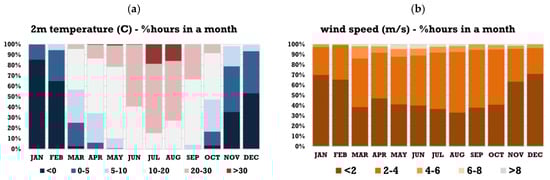 Harsh winters (November to February) with near-surface temperatures below 0 °C for 50–80% of the time, accompanied by slow-moving winds under 2 m/s for more than 50% of the time, are characterized by freezing temperatures, heavy snowfall, and icy conditions (Figure 2a,b). Wintertime snow fall averages at 100 mm per month and peaks at 200 mm, with annual totals reaching 500 to 700 mm between November and February. In addition to snow, precipitation averages at 50 mm per month during the rainy and snowy seasons, with annual totals around 400 to 500 mm. Snow cover can persist for several weeks, impacting transportation and daily activities. The mixing layer (inversion) height, an important proxy for horizontal dispersion and vertical mixing of the emissions is lower in the winter months and lower during the night-time throughout the year, exacerbating the air pollution problems in the city (Figure 2c). A low mixing height means higher pollution levels for the same number of emissions. However, the winter months are also marked with higher emission intensity from space heating demand in the residential and commercial sectors, and this demand is met via combustion of coal and biomass fuels. The share of wind directions is consistent over the year, mostly originating from the south and west.