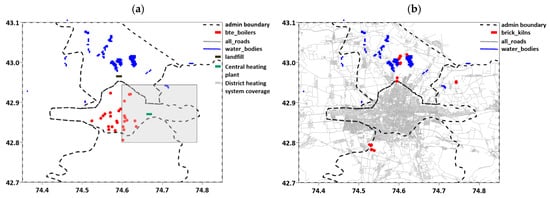 While methodologies and methods are well established to build detailed emission inventories, with multiple applications and examples to follow in global and regional inventories, the lack of model-ready information from the city(s) has always been a concern [21,22,23,24]. Uncertainty in the input data is an important concern in low- and middle-income countries (LMICs) [25], especially those like KGZ with limited information in the public domain that can immediately be utilized in the emissions models. A large part of the emissions modeling exercise in Bishkek was to locate the sources on a map, to build geospatial information necessary for representing various sectors, to construct model-ready inventories, and find proxies where ground data are not available. The Google Earth platform was useful to build these resources for Bishkek, along with physical inspection of select points of interest to assess the combustion and control processes in place.