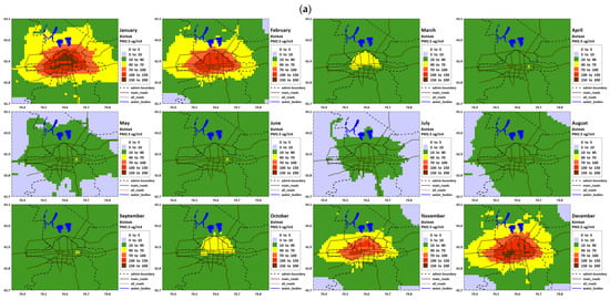 The modeled monthly average PM2.5 concentrations from the WRF–CAMx modeling system for the Bishkek airshed are presented in Figure 6a as maps and Figure 6b as variation in the concentration among the urban grids of the airshed (blue shaded bar). In January and December, concentrations were more than 150 μg/m3 (brown color shade), which was 10 times more than WHO’s daily average guideline (15 μg/m3). These findings were also utilized to pinpoint pollution hotspots within the airshed. Specifically, the northern, western, and eastern areas of Bishkek recorded the highest monthly average concentrations. These areas are primarily inhabited by single-family households that use coal for in situ heating, a trend corroborated by monitoring data from the Clarity sensor network. The total concentrations presented in the figure include contributions from primary particulate emissions and contributions from chemical conversion of SO2 and NOx gas emissions into sulfate and nitrate aerosols. The chemical reactions and gas to aerosols conversion processed are an integral part of the CAMx modeling system [31].
