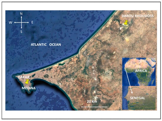 Médina (14°41′06′ N and 17°26′58′ W) is an urban site located on the outskirts of the city of Dakar (4 million inhabitants), close to the coast, 8 m above sea level and 2.6 km from the port of Dakar. The main sources of air pollution are road traffic, cooking activity using wood charcoal, and port activity []. However, recent urbanization, incense burning, and biomass use are noted within households [,].