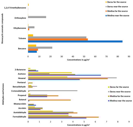 Overall, the 17 VOCs targeted and identified included monocyclic aromatic compounds (benzene, toluene, ethylbenzene, ortho-xylene, and 1,2,4-trimethylbenzene), aldehydes (formaldehyde, acetaldehyde, acrolein, metacrolein, butanal, propanal, crotonaldehyde, benzaldehyde, pentanal, and hexanal) and ketones (acetone and 2-butanone), with a detection limit of 0.05 µg/m3. Of the 17 compounds, 16 were detected in Medina, compared with 14 in Darou Khoudoss. Toluene levels estimated at 70.9 μg/m3 (Medina) and 18.5 μg/m3 (Darou Khoudoss) were the highest compared to other compounds. In addition, the average levels of benzene, formaldehyde, and acetone were 8.1 μg/m3, 5.7 μg/m3, and 5.5 μg/m3, respectively (Medina), and 11.5 μg/m3, 3.7 μg/m3, and 3.32 μg/m3, respectively (Darou Khoudoss). Moreover, except toluene, monocyclic aromatic compounds were found at lower levels in Medina in contrast to aldehydes and ketones. Differences in level were almost all significant (p-value ≤ 0.05)) (cf. Table 1).