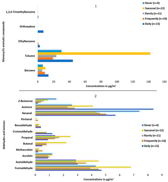 According to incense use, the highest benzene and acetone concentrations were estimated at 13.6 µg/m3 and 8.4 µg/m3, respectively, and were recorded in households where incense burned daily, while the highest formaldehyde levels were observed in households using incense only seasonally (6.8 µg/m3). Moreover, the differences in levels were statistically significant (cf. Figure 3).