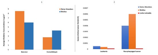 Exposure rate for benzene and formaldehyde (1) and associated lifetime Cancer Risk (2) in Medina and Darou Khoudoss.