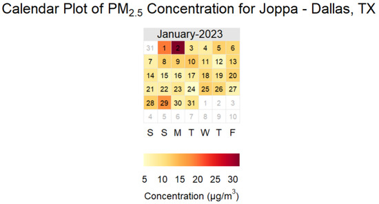 To compare our data with PM standards, we select three distinctly polluted days from Joppa in January 2023. This selection process utilizes a calendar plot, which provides a clear and intuitive visualization of Joppa’s PM data by displaying daily average concentrations in a calendar format. This approach facilitates the identification of patterns and trends throughout the month. is chosen for this study, as it is one of the most critical pollutants reported by the EPA and will also be used in the variogram analysis results. For generating the calendar plot, we use the openair package [50] in R, a powerful toolkit designed for air quality and atmospheric data analysis. Figure 2 illustrates the calendar plot of daily average concentrations for January 2023.
