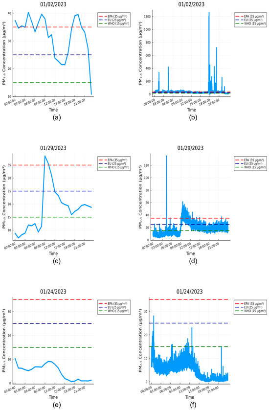 Time series plots of concentrations for three days in January 2023: the most polluted day (2 January 2023), the intermediate polluted day (29 January 2023), and the least polluted day (24 January 2023) in Joppa, Dallas, Texas. (a,c,e) Hourly concentrations for these days. (b,d,f) The concentrations at one-second intervals. The horizontal dashed lines indicate air quality standards set by the EPA (, indicated by a red dashed line), the EU (, indicated by a blue dashed line), and the WHO (, indicated by a green dashed line).