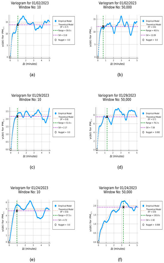 For a selected window, the cross defines the point where the correlations stops. For the various windows, we can see that the correlation stops at different values of time lag. If we consider the 50,000th window in Figure 4b,d,f, we can see that the range of the variogram is 40.9, 76.3, and 193.8 s, respectively. These are the time scales at which the concentration must be measured during the 50,000th window for the highest, intermediate, and least polluted days to capture all the variations. Similarly, we can find the measurement time of the concentration across these days for all windows (85,500 windows for each day). Apart from the range and sill, the plots also show the nugget. We notice that the nuggets are very close to zero, indicating a low tolerance or error in the measured concentration. We also note the the value (Coefficient of Determination) for the various windows across the day. Across the different windows shown in Figure 4, the lower bound of is 0.6, and the upper bound is 0.9. This indicates that the theoretical model (Exponential Variogram) fits decently with most of the Empirical Variogram data.