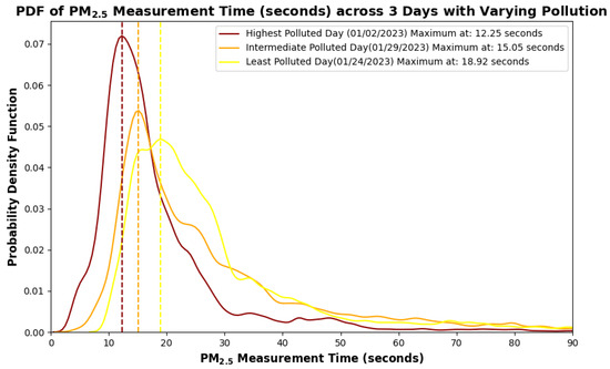 Based on the Rolling Variogram analysis across 85,500 windows for each day selected in the study, a Probability Density Function (PDF) is plotted for the measurement time as shown in Figure 5. This analysis helps identify the most frequent measurement time for , which corresponds to the mode (x-coordinate) of the peak y-value in the PDF. The mode provides a critical insight into how quickly the sensor should measure/sample the concentration to effectively capture all variations in a given neighborhood.