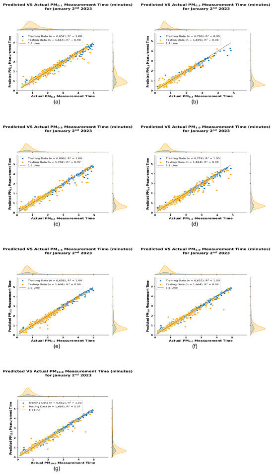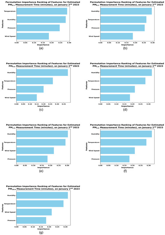 to ) for the month of January 2023. After estimating the PM measurement time for each size fraction, we proceed to assess the impact of various meteorological parameters on this measurement time. For this part of the study, we use parameters such as air temperature (referred to as temperature), atmospheric pressure (referred to as pressure), relative humidity (referred to as humidity), and wind speed, all of which are recorded by the Central Node. Nonlinear and nonparametric regression models are used to estimate the measurement time for each size fraction [40,41,42], using meteorological parameters as input. Wind speed, humidity, temperature, and pressure data from the Central Node are recorded at 10 s intervals. The estimated measurement time for each size fraction is considered as the target variable. We develop seven models corresponding to each of the seven size fractions, using the measurement time as the target variable and meteorological parameters as predictors.