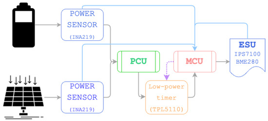 Designed for battery operated or duty cycled applications, the TPL5110 nano timer is a low power, low current timer with an integrated MOSFET driver. Using only 35 nA of power, the TPL5110 is able to enable the power supply line so as to drastically reduce the overall system standby current during sleep time. As a result of its reduced power consumption, it can also be used with smaller batteries, which makes it well suited for energy harvesting and wireless sensor applications, such as the one being implemented [46]. TPL5110 functions to shut down an MCU after a predetermined period of time and reactivate it after another predetermined period. This is particularly helpful if the system enters a sleep cycle when manual intervention is not possible in the field. However, the main purpose of the TPL5110 is to preserve energy efficiently. TPL5110 serves as a bridge between the PCU and MCU. In the design architecture of the system, embedded firmware is run inside of a MCU during its life cycle. TPL5110 allows us to choose the period in which the system will reset and rerun the firmware. A potentiometer is used to alter the period. In the current configuration, we used an external resistor to achieve this. The external resistor is set to limit the life cycle to a maximum of 15 min. However, in most cases, the timer will cut off power to the MCU much sooner, depending on the battery’s stored energy and the solar panel’s real-time output. This is accomplished through a signal sent through to the TPL5110 from the MCU after the power metrics are measured via the INA219s.