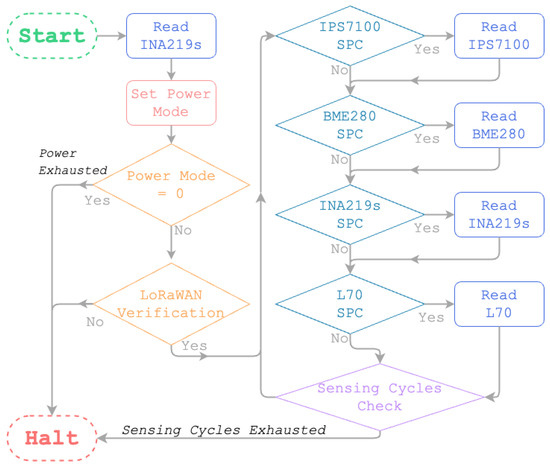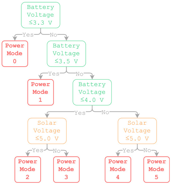 The sensing system is intended to obtain sensor measurements and transmit the data in a sustainable manner. The duration of a single firmware life cycle is 15 min, and its operation is depicted in Figure 3. During a single life cycle, the first step is to read current battery and solar power voltages using the two INA219s and select a power mode. Figure 4 illustrates the different power modes. In the event that the sensor does not receive sufficient power, power mode 0 is set and the TPL5110 is used to set the system to sleep for the remaining duration of the current life-cycle.