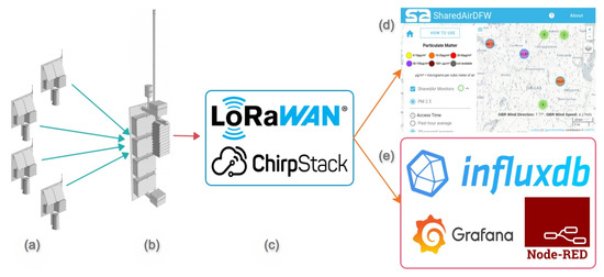Network Architecture: In addition to LoRaWAN end nodes (a), the network consists of a LoRaWAN gateway embedded within an integrated sensing suite called the ‘Central Node’ (b), a LoRaWAN cloud (c) utilising the open-source ChirpStack LoRaWAN Network Server, the SharedAirDFW public portal (d) that provides access to up-to-date Sensor Data, as well as a comprehensive analytical toolbox (e) using influxDB, Grafana, and Node-RED.