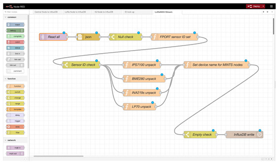 Node-RED is a graphical programming tool that provides a collection of interfaces to hardware, data APIs, and more. Using a selection of processing nodes, the user generates a flow diagram representing the data ingestion and processing pipeline, which can be easily deployed with one click. A key advantage worth highlighting is that Node-RED’s low/no-code approach allows for an easily maintainable and scalable solution that can be adapted to new sensors and architectures. In Figure 6, the menu of nodes is visible on the left, while the deployment flow is shown in the center.