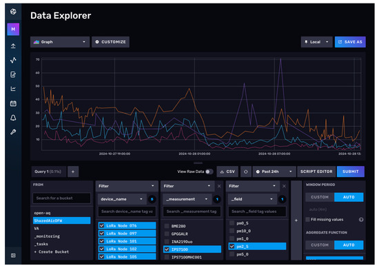 InfluxDB Data Explorer: A sample query is generated to select PM2.5 data from multiple LoRaWAN Nodes.