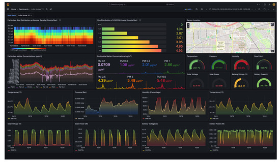 The high degree of spatial variability in environmental conditions necessitates a robust computational infrastructure capable of managing thousands of individual time series. This infrastructure must support real-time analysis, pollution alerts, and, ultimately, particle tracking and forecasting capabilities. To that end, we have developed a containerized solution comprising three open-source docker images: Node-RED, InfluxDB, and Grafana [49,50,51]. Node-RED allows us to easily ingest and process incoming sensor data in a simple graphical pipeline. This data is then injected by Node-RED into InfluxDB, a time-series database optimized for handling high frequency data from thousands of sources. Finally, Grafana is then connected to the database to enable dynamic, highly configurable, real-time visualization dashboards. These dashboards provide an interactable web interface to the data beyond what the current website enables.