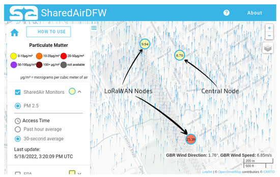 Shared Air DFW Public Portal: Shared Air DFW is an initiative operating out of a University of Texas at Dallas laboratory, dedicated to deploying monitoring systems designed and built by university students. Particulate matter data collected from these monitors, as well as information from EPA and DFW Purple Air monitors, are displayed in real time on a digital map accessible by anyone at www.sharedairdfw.com (accessed on 18 May 2022). The project is sponsored by the National Science Foundation, Earth Day Texas, the US Army, Downwinders at Risk, the City of Plano, and the US Environmental Protection Agency.