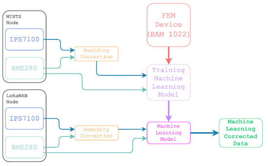 Previous research indicates that low-cost particulate matter sensors are affected by a range of environmental factors, such as humidity, temperature, and atmospheric pressure [54,55,56]. To improve the accuracy of these sensors, advanced machine learning algorithms are employed to calibrate humidity-adjusted readings, resulting in a more accurate representation of actual PM concentrations. The calibration process involved co-locating a low-cost sensing system, referred to as a MINTS Node (developed at the University of Texas at Dallas as part of the Multi-Scale Integrated Intelligent Interactive Sensing (MINTS) research program), with a sensing package similar to that of the LoRaWAN nodes near the Hawks Athletic Center in Fort Worth, Texas. This setup was placed alongside a Federal Equivalent Method (FEM) device, specifically the BAM 1022—Beta Attenuation Mass Monitor, which continuously collected particulate data for comparison.