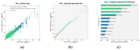 Eleven input variables were used in the multivariate non-linear machine learning regression model. These included humidity-corrected particle counts for particle sizes of 0.1 m, 0.3 m, 0.5 m, 1 m, 2.5 m, 5 m, and 10 m, along with key environmental factors such as atmospheric pressure, temperature, dew point, and relative humidity, collected using the BME280 sensor. The model’s performance, evaluated using the independent validation dataset, is illustrated in Figure 12, with key variables highlighted from the calibration process.