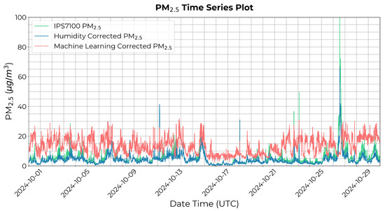 After developing the machine learning model, we applied it successfully to data collected from sensors across our network. Figure 13 shows a time series from a LoRaWAN sensor deployed at the University of Texas at Dallas in Richardson, Texas, for October 2024. The figure compares the raw PM2.5 measurements from the IPS7100, the humidity-corrected PM2.5, and the machine learning-corrected PM2.5 values.