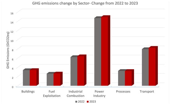 The transportation sector is considered one of the most energy-demanding areas, currently responsible for approximately 20% of the global greenhouse gas (GHG) emissions []. Last year, transport faced the largest increase in GHG emissions, with over 301 megatons of carbon dioxide (CO2eq), a relative increase of 3.7% (shown in Figure 1), as stated in the EU report [].