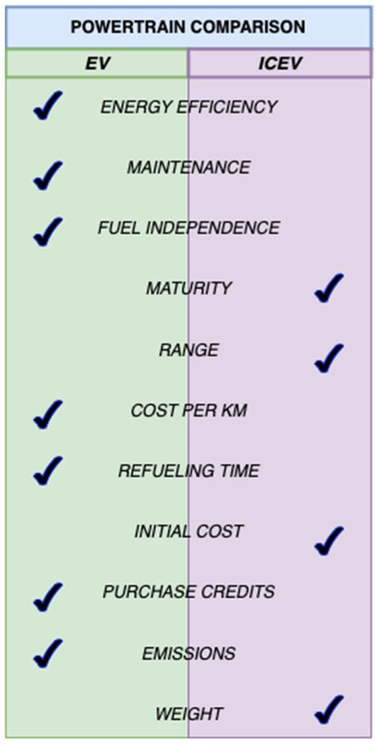 EVs utilize an electric motor as the propulsion system, powered by a high-voltage lithium battery pack, while a 12 V auxiliary battery is responsible for secondary loads such as lights and the multimedia system []. The climate control (CC) module, which is highly efficient, is directly driven by the high-voltage battery and consumes over 15% of the total load, even though the driving range is compromised with extended CC use. It is expected that EVs will account for 50% of the global automobile market by 2050, and the literature shows a very promising future in the context of minimizing GHG emissions []. However, for massive adoption, such limitations as range, limited battery lifespan, high toxicity levels from mining, and the availability of public chargers in central spots should be addressed [,]. A direct comparison between the two technologies is depicted in Figure 2.
