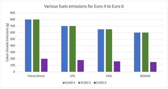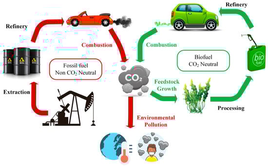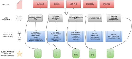 The two most common biofuel types are bioethanol and biodiesel, while other e-fuels including green diesel, obtained by pyrolysis and hydrogenated vegetable oils (HVO), can be employed []. Bioethanol is usually found in 5%, 20% and 85% proportions as the E5, E10, and E85 fuels, with only the last two being compatible with modern vehicles. For the hydrotreatment, hydrogen is utilized in the production process, and must be produced by renewables, otherwise the application is not feasible []. With the use of these neutral fuels, emissions can be reduced by up to 40%, while HVOs’ high energy density makes them suitable for application in aviation. In 2025, bio-based components will account for 10% of the fuels used in Europe []. The need for biofuel utilization with respect to pollution is illustrated in Figure 6 [].