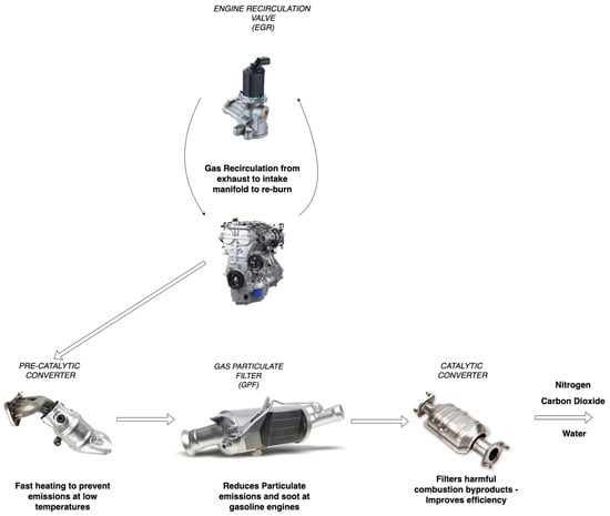 The main parts of a gasoline exhaust system are presented in Figure 4 [,,].