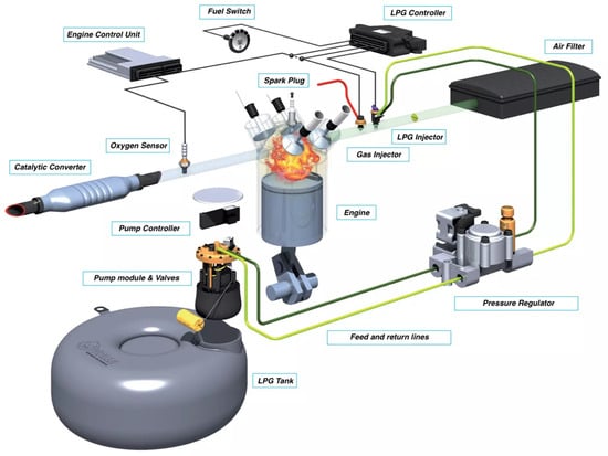 LPG systems can be implemented to conventional petrol engines without any modifications; hence, many companies provide plug-and-play kits for different car brands. A study [] showed that mixing LPG with 5% hydrogen further reduces GHG emissions by 25–30% at various ambient temperatures. The only drawback of LPG systems is the expansion of the fuel in the heat, so the auxiliary fuel tank that is installed, usually in the trunk, must be filled maximum to 80% capacity []. The complete layout of a typical LPG installation with any common kit includes []: