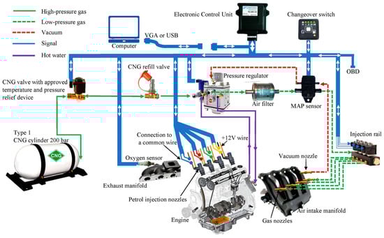 Natural gas is another acclaimed fuel that can be integrated into a conventional vehicle with a plethora of benefits []. It is found in two forms: liquidized (LNG) and compressed (CNG), with the latter already employed in several internal combustion engines, both by the manufacturer and as an aftermarket layout in dual-fuel mode []. It comprises methane in a 96–98% ratio, has a significant octane rating of 130, and as it is extremely vaporizable, a highly homogeneous mixture is formed [,]. As the mix burns at a lower temperature, nitrogen oxides are reduced by over 75% and carbon monoxide decreases by 25% with cold starts having an insignificant effect on emissions. This is the reason why CNG is considered an ideal fuel for implementation in conventional vehicles, being the most efficient, economical, highly applicable, and widely available fuel with minimum GHG emissions []. The main drawback is that CNG is stored in gaseous form in high-pressure steel tanks, so their storage requires extra space, which natural gas fuel stations cannot provide []. The complete layout of a typical indirect CNG system is demonstrated in Figure 8.