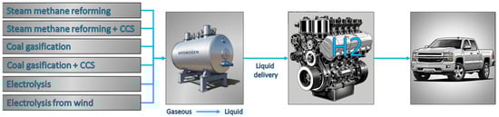 Hydrogen is gaining popularity as a fossil fuel alternative due to the lower environmental impact it causes. It is mainly produced from fossil fuels, but it can be extracted from water through electrolysis powered by renewables []. It is the most abundant element on planet Earth, with a calorific value of 120 MJ/kg, so it can be used in ICEs at a fuel ratio of 34 to 1, with high diffusivity and 20% more power. In addition, the increased auto-ignition temperature (585 °C) allows for higher compression ratios (CR) and increased efficiency, but with an increase in nitrogen oxides in the exhaust and engine knock []. Most studies suggest that hydrogen should be applied as an additive to gasoline or diesel engines through direct injection to offer the characteristics of a dual-fuel layout. Hence, high compression ratios that will let engineers surpass the 50% efficiency mark for ICEs with proper engine design are necessary []. The lifecycle of hydrogen for internal combustion engines is presented in Figure 9 as a workflow [].
