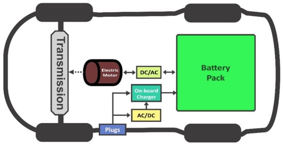 Configuration of an EV. The onboard charger manages the flow between the battery and the motor as well as the supply via the plug [].