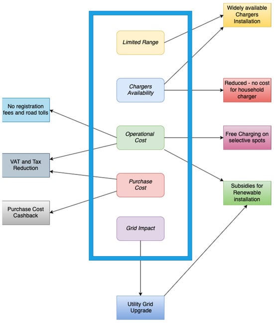 Charger availability is currently an issue. Public chargers are continuously being installed, with a capacity of up to 1 MW by Tesla, while increased subsidies are being applied for users to purchase and install a charger at their households []. A second option is applicable mainly to users who live in individual houses or at least own a parking spot to install a private charger. Public ones are still necessary in cases of long trips and in highly crowded areas such as shopping centers and workplaces. That is why additional policies promote this infrastructure with tax reductions and low-interest loans []. However, the energy cost is still high, almost up to 4 times the cost of home charging, due to the increased capital cost of the equipment. Hence, this option appears less viable for now [].