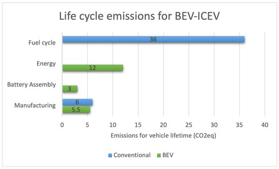 Since no fuel is consumed, there are no GHG emissions; however, emissions from other lifecycle stages, such as production, are still significant, amounting to almost 10 tons more than for a corresponding ICEV. This trend is mainly affected by battery manufacturing, with a carbon footprint of 120 kgCO2/kWh, although this process is expected to be carbon-free by 2050 [,]. Charging via the power grid varies in emissions, as countries with high renewable or nuclear energy use such as Norway and France have almost eliminated power generation emissions []. However other countries, such as Poland, India, and China rely heavily on fossil fuels, making EV adoption less impactufl and, in some cases, close to ICEs in terms of pollution []. EV adoption must be combined with renewables sources for power generation to achieve the goals established by the EU’s Green Deal. Solar and wind power can also be employed at public charging stations to reduce the carbon footprint by 90%. Thus, EV adoption needs to be combined with green energy production [].