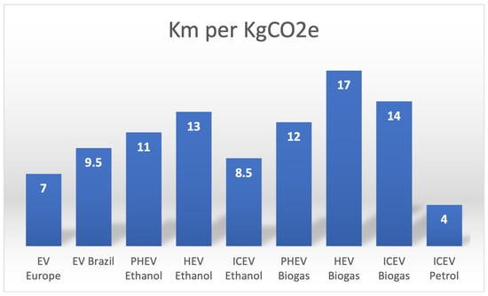 Biofuels are considered a viable alternative fuel in blends such as B10 with 90% petrol and 10% biofuel or B20 at a ratio of 80% to 20%, respectively. In a study in Malaysia, these 2 blends were tested using widely available palm oil as biofuel in a typical 2000 cc ICEV and a two-wheeler []. The results showed that such a transition was not highly effective, as emissions from biodiesel production were close to normal diesel combustion, 2.68 kg CO2eq/L compared to 3 kg CO2eq/L, while palm oil production needs to be enhanced, leading to extensive land utilization.