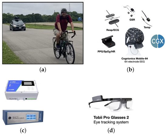 Experimental paradigm for the data collection of the biometric variables of a participant and ambient pollutants. (a) Participant cycling outdoors wearing a biometric suite to measure biometric variables, with an electric car in tandem to measure ambient pollutants. (b) Biometric devices from Cognionics used to capture biometric variables such as heart rate, , respiration rate, ECG, GSR, temperature, and EEG. (c) Sensors placed in the trunk of the electric car to measure ambient (top) and ambient and NO (bottom). (d) Tobii Pro Glasses 2 device for pupillometric measurements. Source: Figure 1 is from [17].