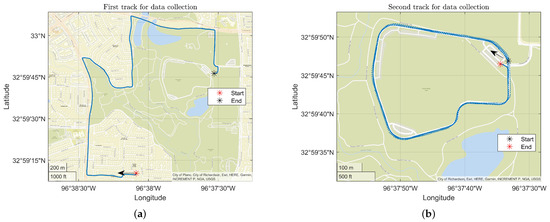 Data collection started on the first track at the location indicated by the red asterisk in Figure 2a. Data collection on the first track was stopped for a while at the location indicated by the black asterisk in Figure 2a, before data collection started on second track, as shown by the black asterisk sign in Figure 2b. Multiple loops were completed on the second track before data collection was stopped. These two tracks were used on multiple days for data collection.