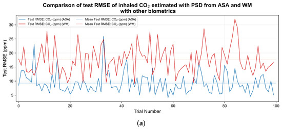 Figure 3a shows the changes in the RMSE in an independent test for in each of the trials when the physiological responses were combined first with the PSD obtained by the WM and then with the PSD from the ASA. The figure shows that, in the majority of cases in the trial, the RMSE was smaller when the PSD from the ASA was used with other biometrics. On the other hand, Figure 3b,c shows that the results of the test RMSE in the case of and NO, respectively, exhibit a small improvement when the physiological responses were combined with the PSD from the ASA, compared to when the physiological responses were combined with the PSD obtained by the WM.