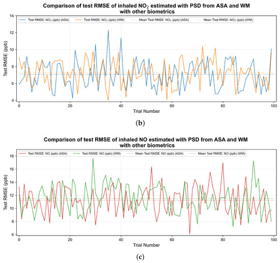 A line graph of the test RMSE in each of the 100 trials when the physiological responses were combined first with the PSD from the ASA and then with the PSD obtained by the WM to estimate the inhaled concentrations of (a) , (b) , and (c) NO.