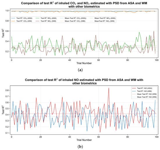 Similarly, Figure 4 shows the line graph of the value between the true and estimated values of the pollutant in an independent test set for each of the 100 trials. Figure 4a shows that in the case of , the value is closer to 1 in most cases when the physiological responses were combined with the PSD from the ASA compared with when they were combined with the PSD obtained by the WM. Similarly, a small improvement in test can also be seen in the case of and NO, as shown in Figure 4a and Figure 4b, respectively.