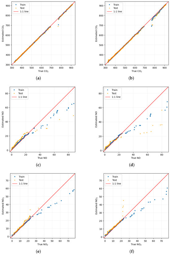 A scatter plot of an instance among the 100 trials for each of the pollutants is shown in Figure 5. On the left, we have the scatter diagram for when the input features were a combination of the physiological responses and the PSD from the ASA for each pollutant: (a) , (c) NO, and (e) . On the right, the input features were a combination of the physiological responses and the PSD obtained by the WM for each pollutant: (b) , (d) NO, and (f) . The curves above and to the right of these scatter plots indicate the density curves of the data points for the true values and estimated values, respectively. In each of these figures, the training data are represented by blue circles, while the testing data are represented by orange circles. Given the improvements in estimation when the physiological responses were combined with the PSD from the ASA—compared with the estimation obtained using the same physiological responses combined with the PSD obtained by the WM—the data points on the left are closer to the 1:1 line than to the 1:1 line on the right. This is clearly visible for , as a significant improvement in the average test RMSE value was obtained in this case when compared to the case of and NO. In the case of and NO, the scatter plots for both cases are similar, as the improvements in these two cases were found to be small. This is indicated by the and RMSE between the true and estimated values for these pollutants in their corresponding figures. The estimation for these two pollutants, however, seems to be good for small values of the pollutants, whereas the points tend to deviate from their corresponding 1:1 line as the values increase, as shown in Figure 5c–f.