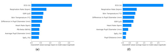 In the process of estimating inhaled concentrations of , , and NO, we used a large number of input variables—specifically, 328. As mentioned in Section 2.3, in order to identify the importance of the features, a SHAP value summary plot was plotted, as shown in Figure 7. The bar graphs are arranged in descending order such that the feature with the highest importance is at the top. Since the number of input features are high, the ranking of the variables, especially when the SHAP values are close, can vary when the data are shuffled, whereas the ranking of the variables at the top remain consistent, as their SHAP values are higher compared to the other variables. Figure 7a,c,e show the feature importance plots when the physiological responses were combined with the PSD from the ASA, whereas the figures on the right (Figure 7b,d,f) show the feature importance plots when the same physiological responses were combined with the PSD obtained by the WM. Each of the feature importance plots shows that responses such as average pupil diameter, GSR, skin temperature, respiration rate, and ECG are common in the majority of cases.
