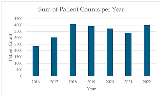 Figure 1 shows the annual distribution of patient counts throughout the study period. Variations can be observed during the COVID-19 pandemic years (2020–2021). We observed a 4.8% decrease in admissions in 2020 compared to 2019, and a further 9.1% decrease in 2021 compared to 2019 levels, likely reflecting the impact of the pandemic on healthcare utilization patterns. However, our case-crossover design inherently controls for these temporal trends by comparing exposures within the same month, thereby adjusting for pandemic effects on overall admission rates. Additionally, our time stratification by day of week, month, and year further accounts for these systematic temporal variations. The 2022 data show a return to pre-pandemic admission levels, which provides another useful reference period within our analysis.