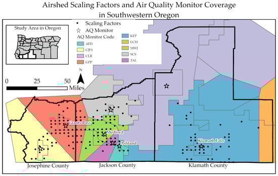 Map of the study area, including Josephine, Jackson, and Klamath Counties, Oregon, displaying the airshed scaling factors as the 4 km grid points in populated areas and the coverage zones associated with each air quality (AQ) monitor. The monitor coverage areas are delineated by different boundary colors, and the associated monitor location is shown with the same color star, including Ashland Fire Department (AFD), Cave Junction Forest Service (CJF), Crater Lake (CLR), Grants Pass Parkside (GPP), Klamath Falls Peterson School (KFP), Lakeview Center and M St (LCM), Medford Welch and Jackson (MWJ), Shady Cove School (SCS), and Talent (TAL).