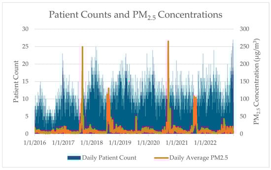 Daily average patient counts compared to daily average PM2.5 concentrations across all study monitors during the study time frame.